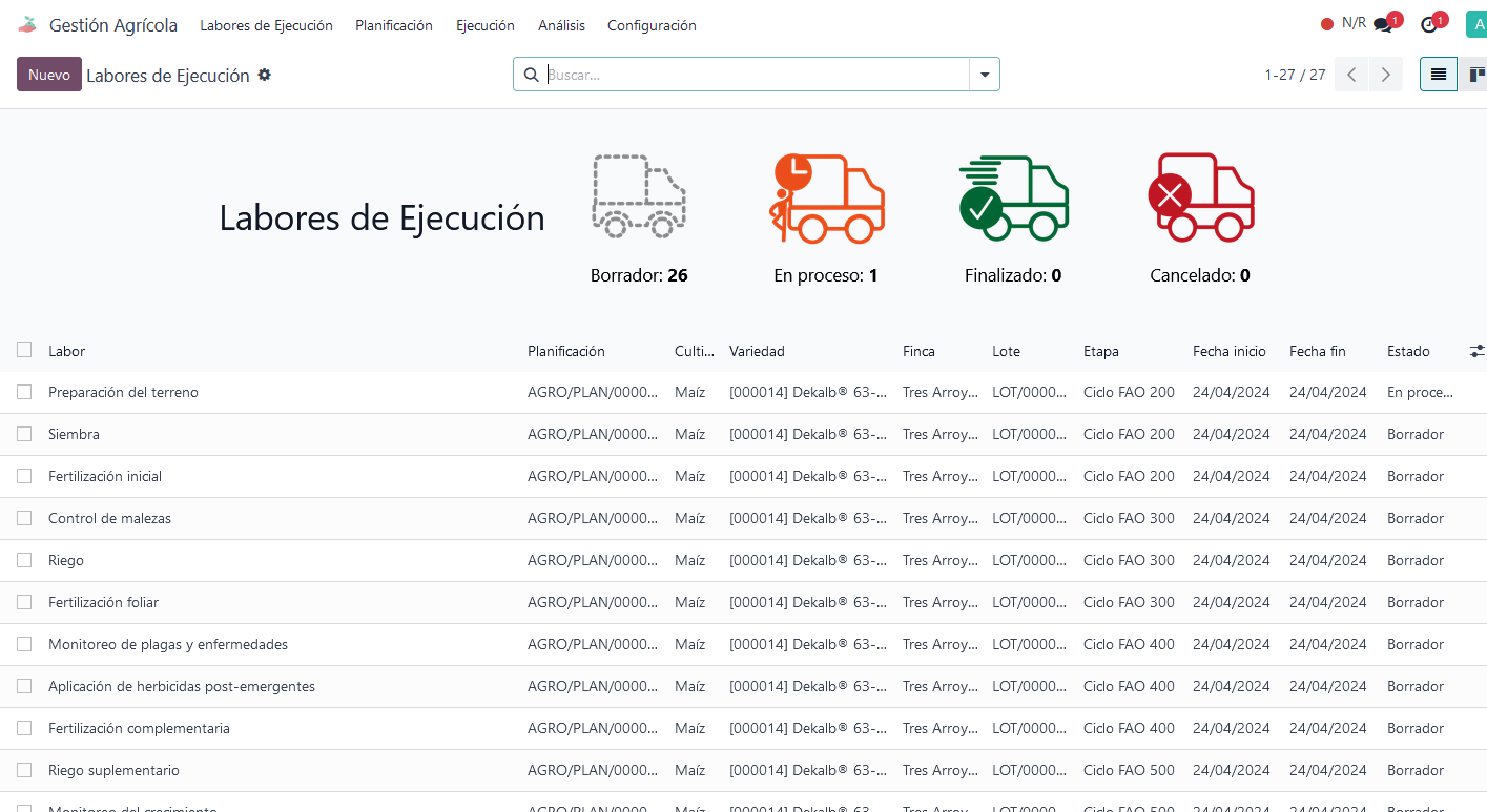 Cada ciclo de siembra se planifica tomado en cuenta la parcela o lote a sembrar, tomando en cuenta la variedad del cultivo, el rendimiento y fecha de cosecha, toda la agenda agrícola proyectada y tener todo el control en la ejecución.