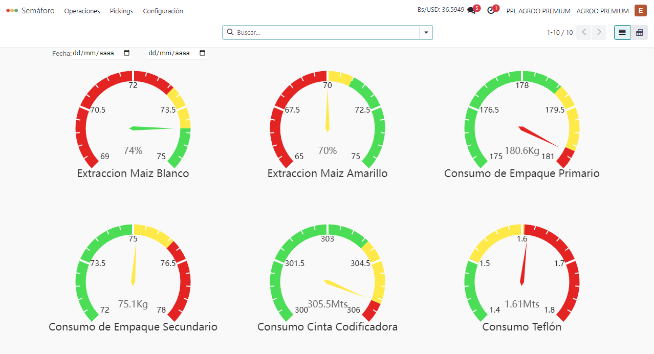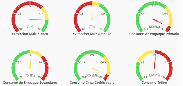 Presenta gráficos tipo velocímetro para tener índices por producto fabricado y los subproductos generados en las ordenes de fabricación.
